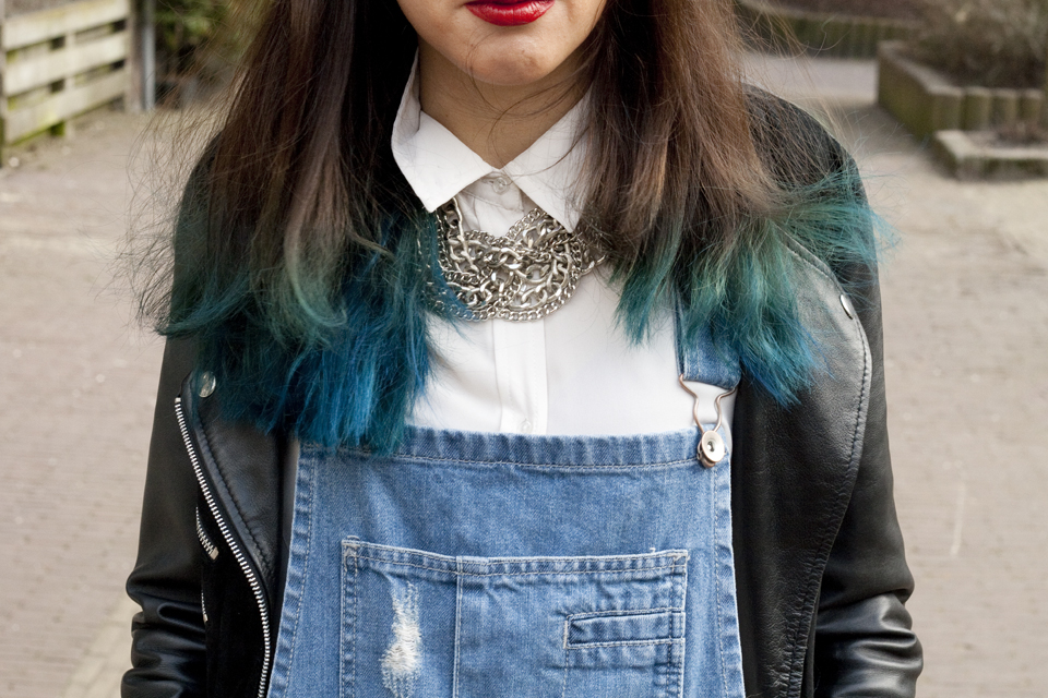 leather biker jacket: warehouse (similar here) denim dungarees: asos (sold out, same model in a darker hue here) shirt: primark (similar here) necklace: h&m (similar here) glove bag: maison martin margiela x h&m (impossible to find something similar, but cute little bag here) cube heel pumps: cheap monday (here)