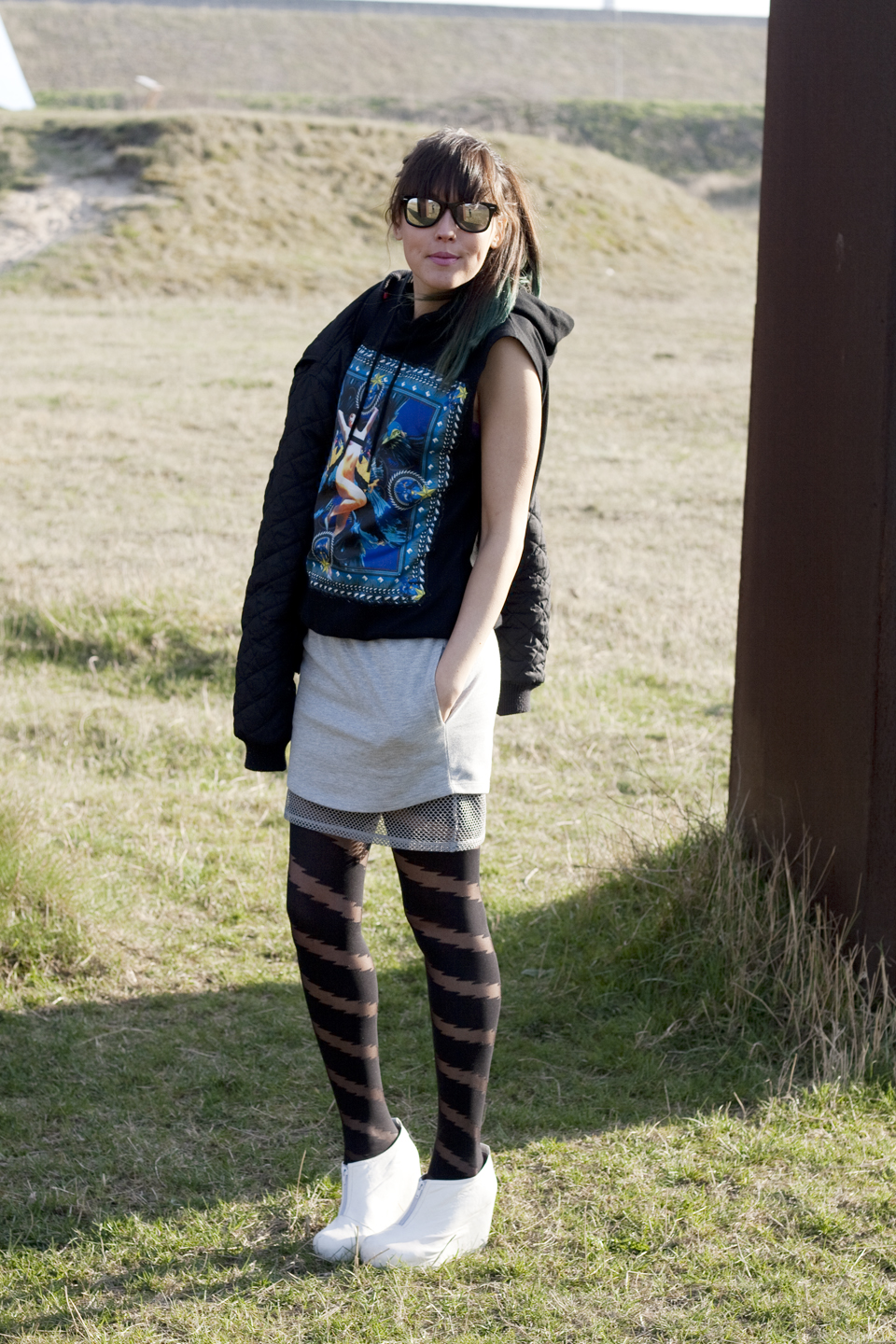 bomber jacket: h&m (similar here) hoodie: givenchy (similar here) grey mesh skirt: weekday (similar here) thunder tights: topshop (similar here)