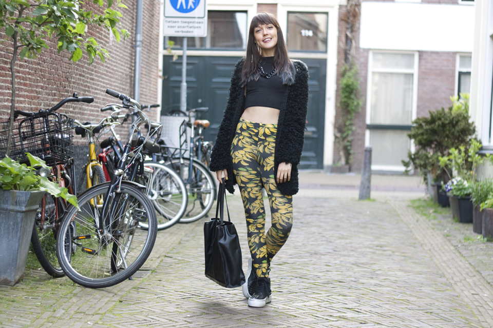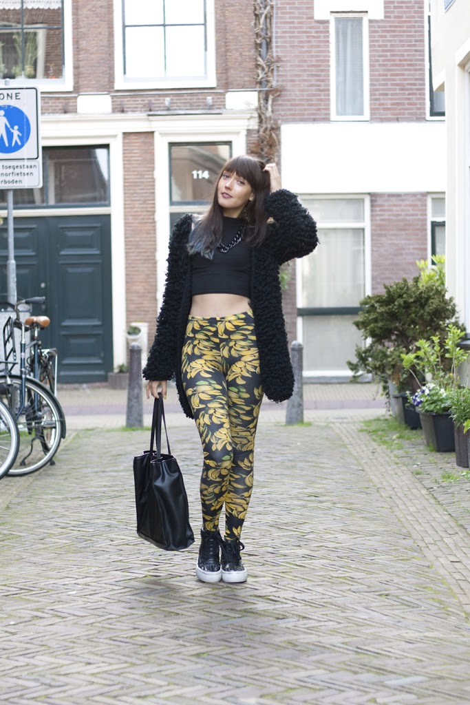fluffy black cardigan: vintage (similar hereblack crop top: ebay (similar herebanana leggings: topshop (similar hereblack shopper: zara (similar here) studded flatform sneakers: bronx (here