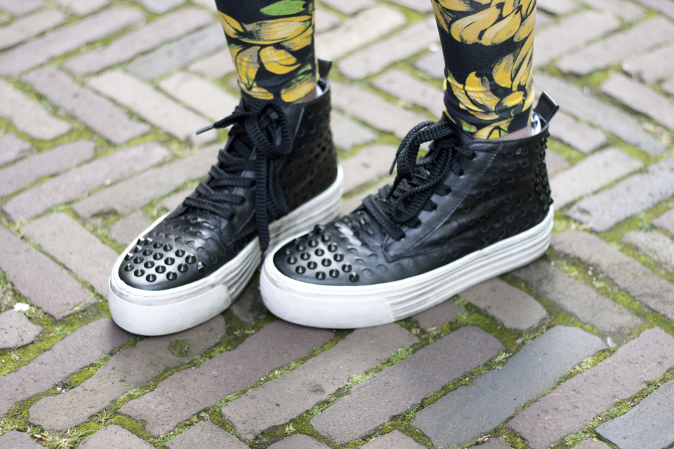 For todays look I got sent a pair of badass sneakers from Bronx, courtesy of Shoemixx.nl. When I first saw these babies, they immediately reminded me of pop stars like Jessie J, Rihanna and Rita Ora. This called for an eye-catching outfit! After having pineapples all over my legs I’m now presenting another feast for your eyes: a fruity Prada inspired classic. Go bananas!