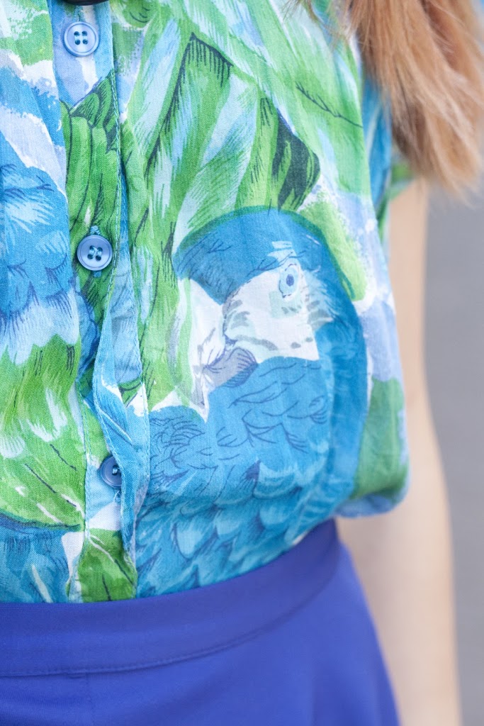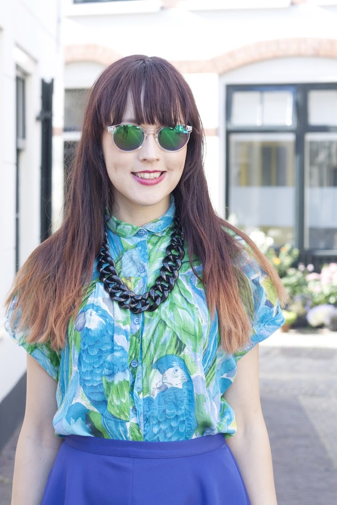 I love visiting flea markets, because every once in a while I seem to find a real gem in there. Last weekend I visited a huge flea market in Amsterdam, at De IJhallen for those who know it. Almost every stallholder sells clothes and although you would expect them to sell vintage stuff, most of them will just sell their old H&M and Zara goodies. If you are lucky you’ll sometimes find a high-end brand in there as well. But for me the best finds are still vintage finds. I love the fabrics and patterns that were used in the 50s-80s. It’s not that often that I find a cool piece, but this time I was lucky. I just love the colours of this blouse and the print is plain awesome. I mean: parrots?! Love it! I’m pretty sure I’ll be wearing this loads.