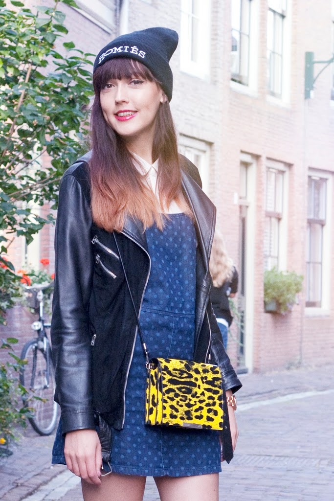 pinafore dress courtesy of asos / homies beanie: ebay (similar) / leather & suede biker jacket: warehouse (similar) / yellow patent leopard print bag: monki (similar) / white blouse: primark (similar) /neon sneakers: nike air max 1 (similar)