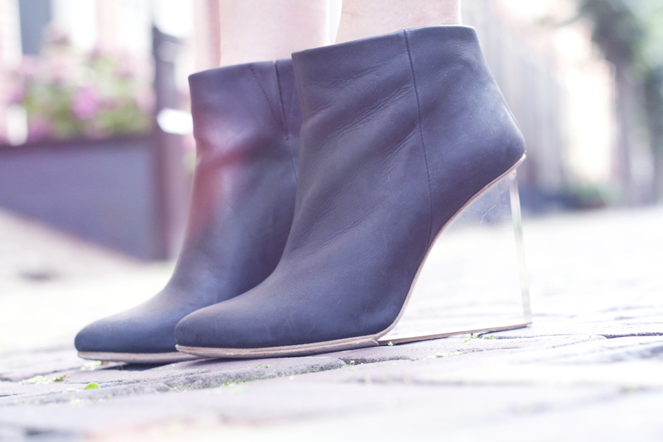 pinafore dress courtesy of asos (here) mirrored sunglasses: asos (similar here) black boyfriend blazer: topshop (similar herepierced clutchnowhere (similar here sheer navy blousetopshop (similar here) booties with lucite heelmaison martin margiela x h&m (similar here