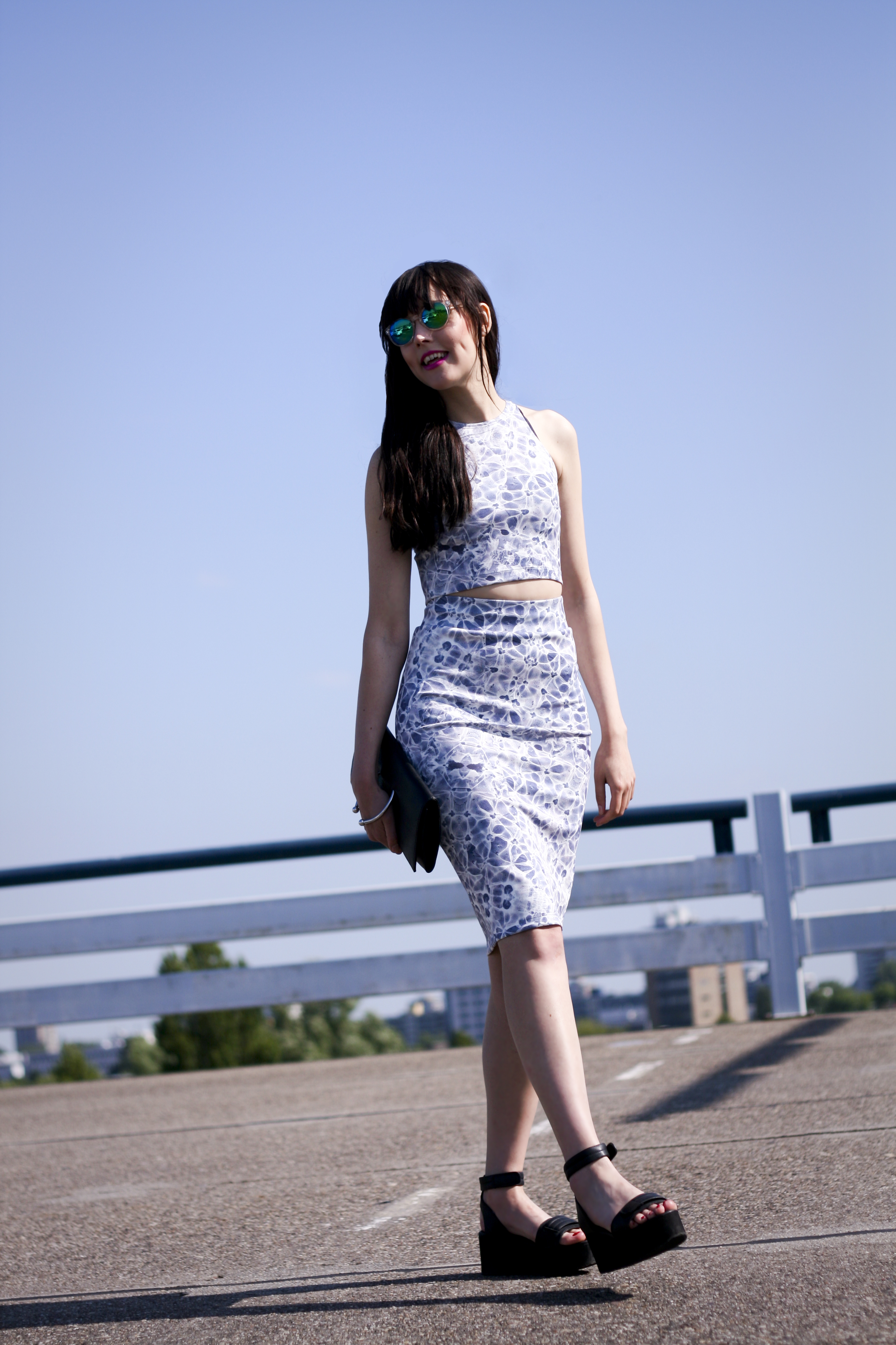 matching skirt + crop top set courtesy of aka clothing / pierced clutch nowhere / flatform sandals h&m / mirrored sunglasses asos